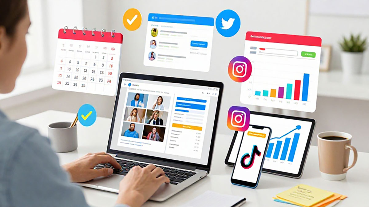 Berbagai platform seperti Buffer, Hootsuite, atau Meta Business Suite memudahkan penjadwalan posting:
